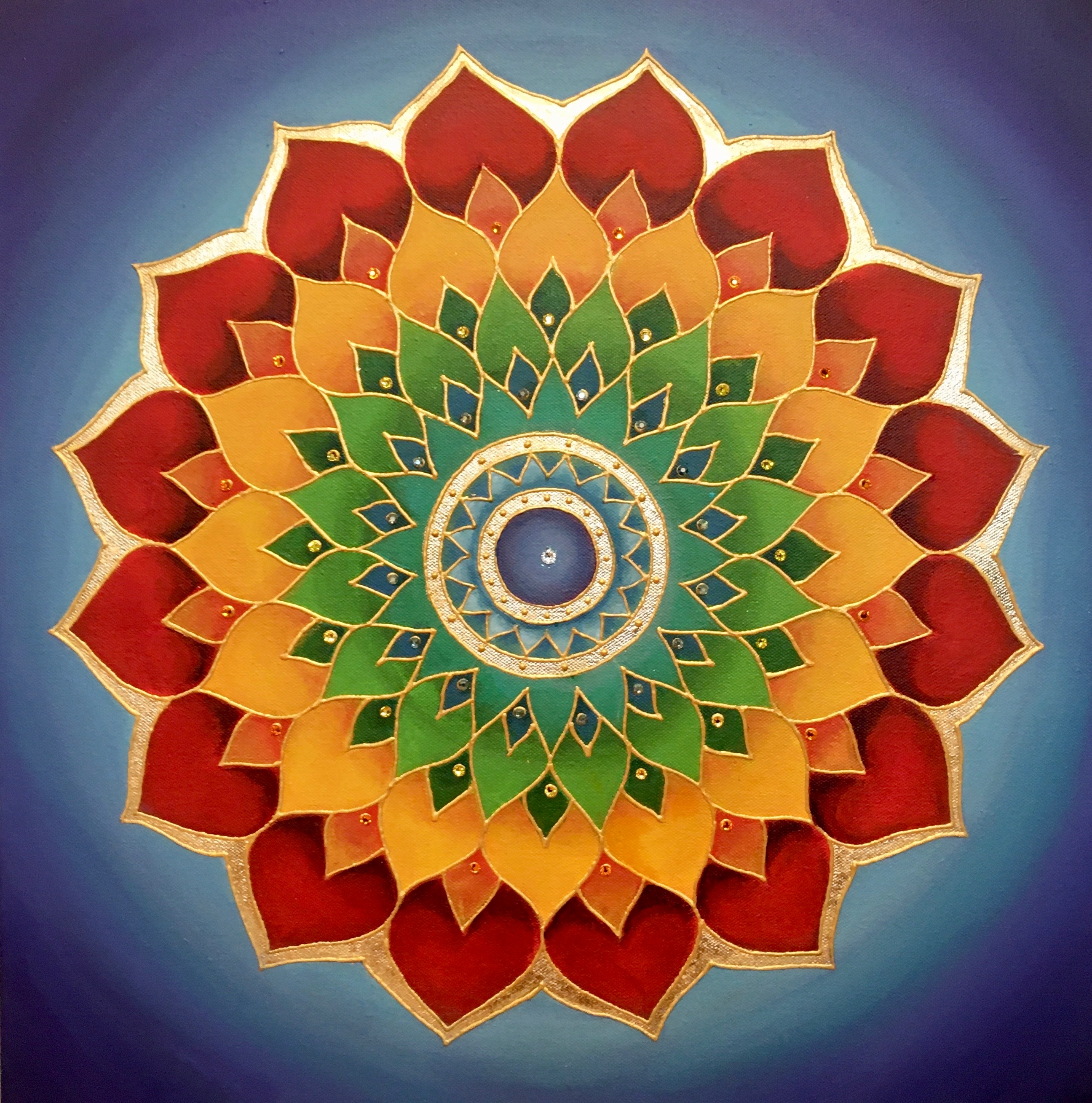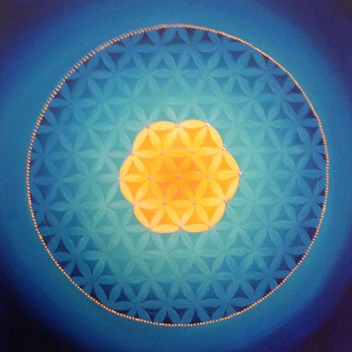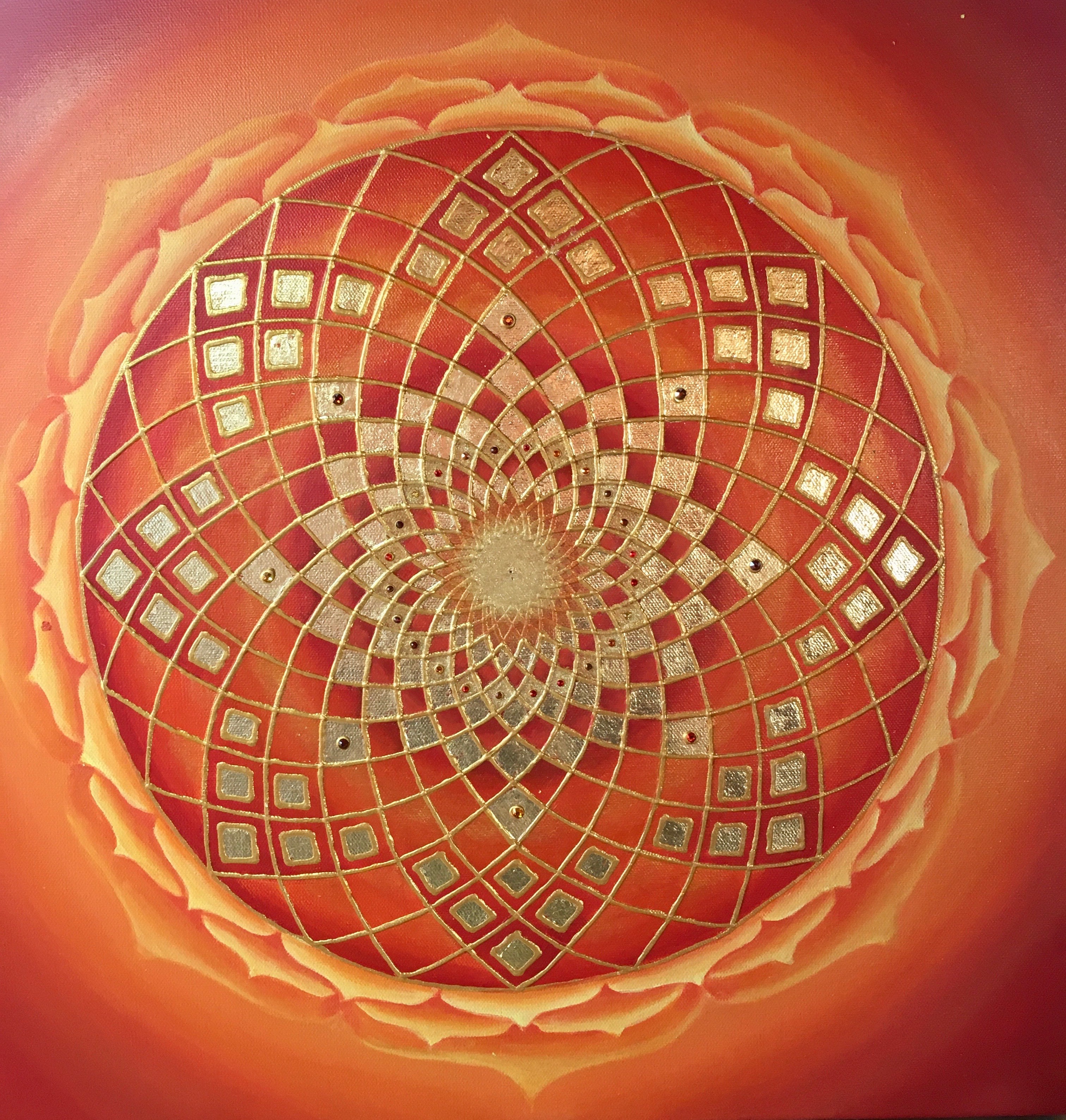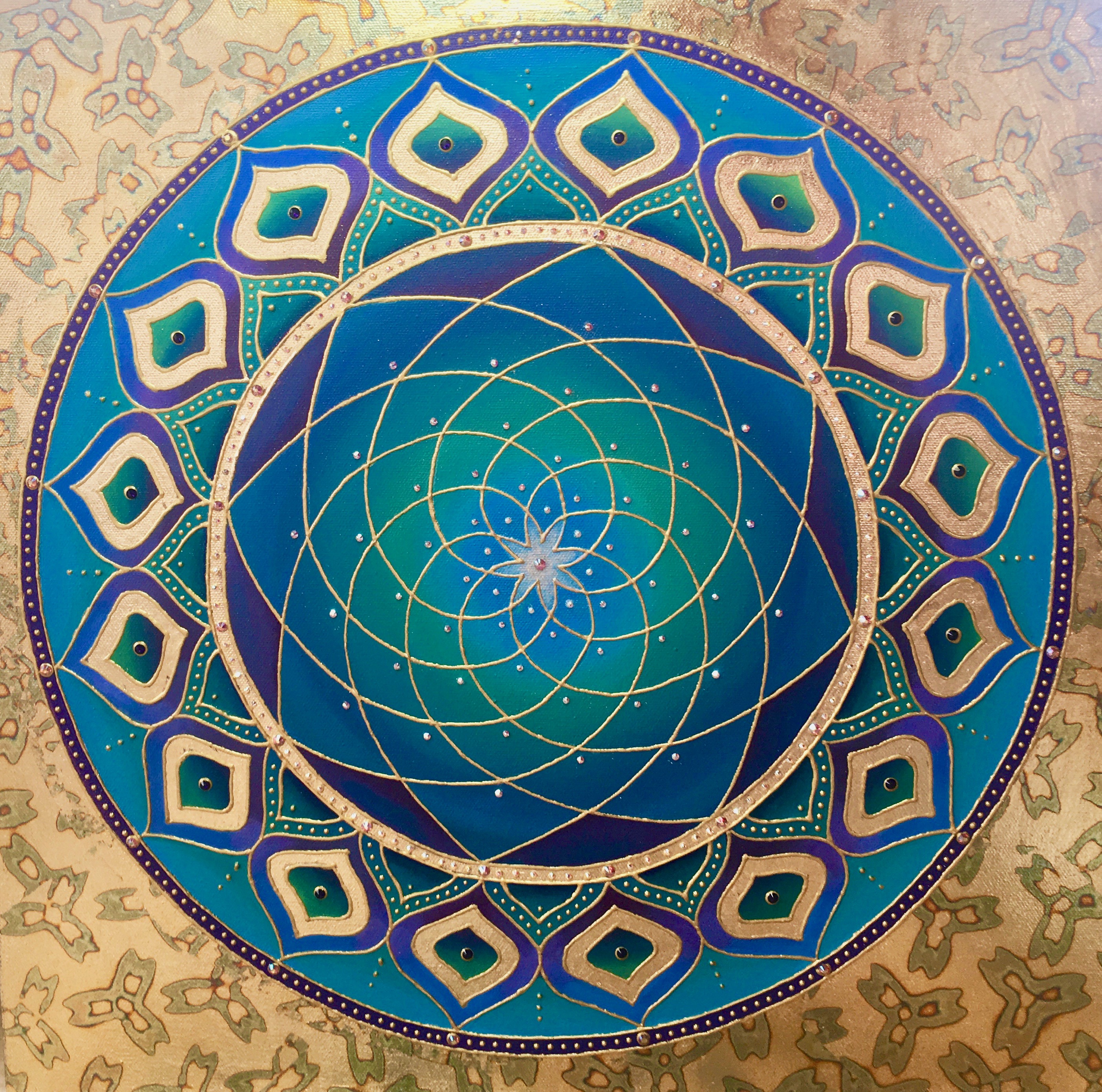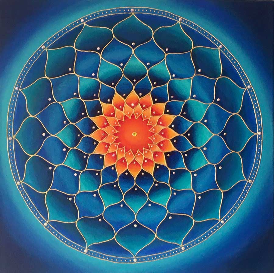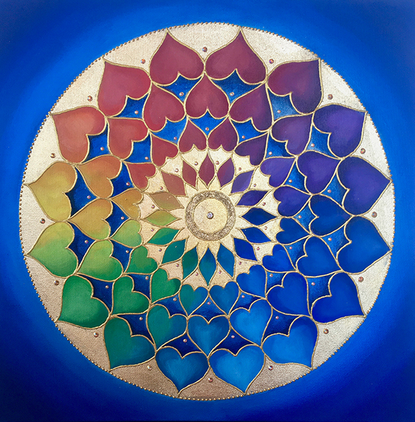 I’m attracted to symmetry, the beauty of form arising from balanced proportions. Colors and forms in nature are often my inspiration. My paintings may resemble the sun, ocean, sky, clouds, mountains, rainbows, peacocks, or a sunflower. Mandalas represent ‘wholeness,’ helping us connect to our center and embody a feeling of holistic completeness.