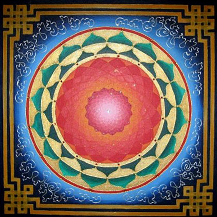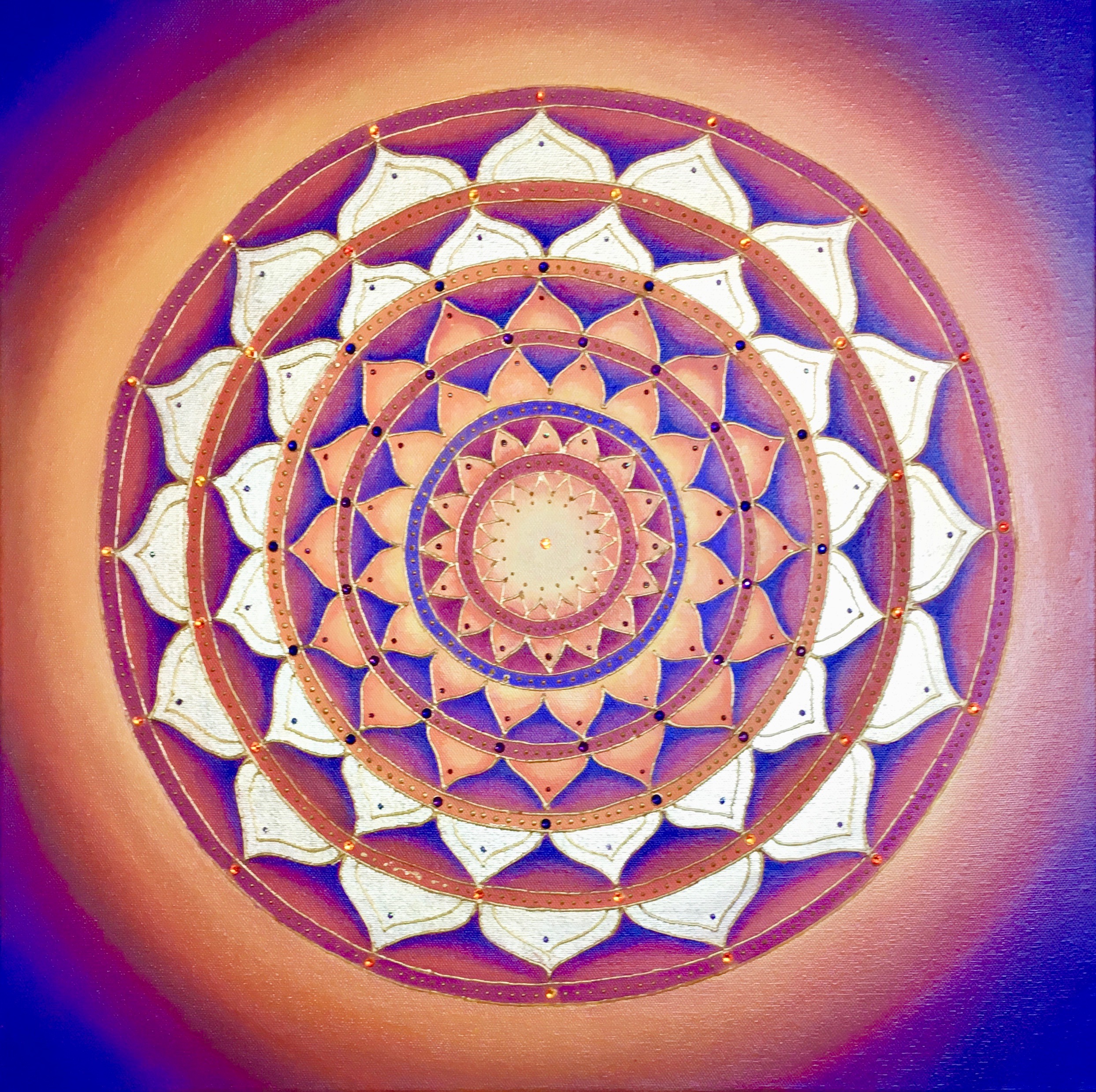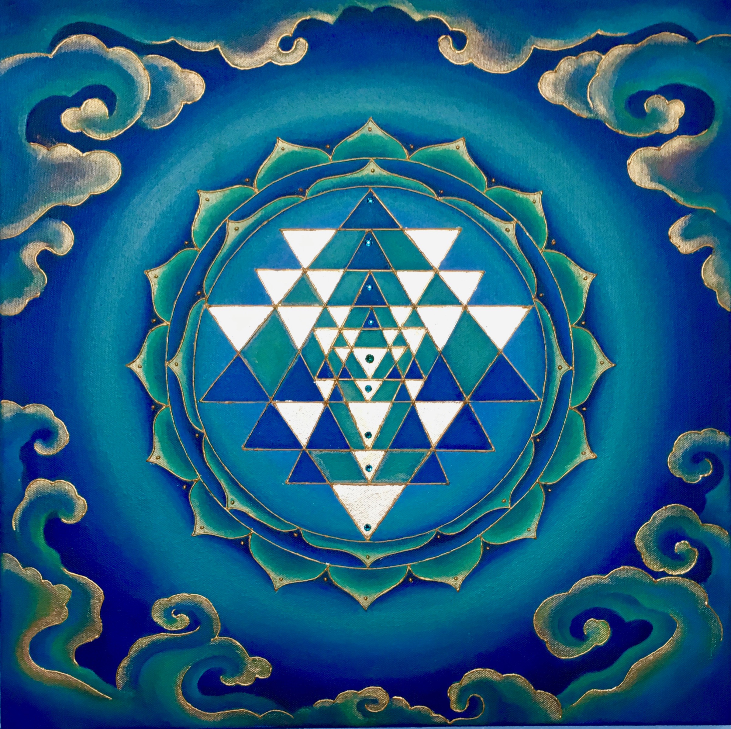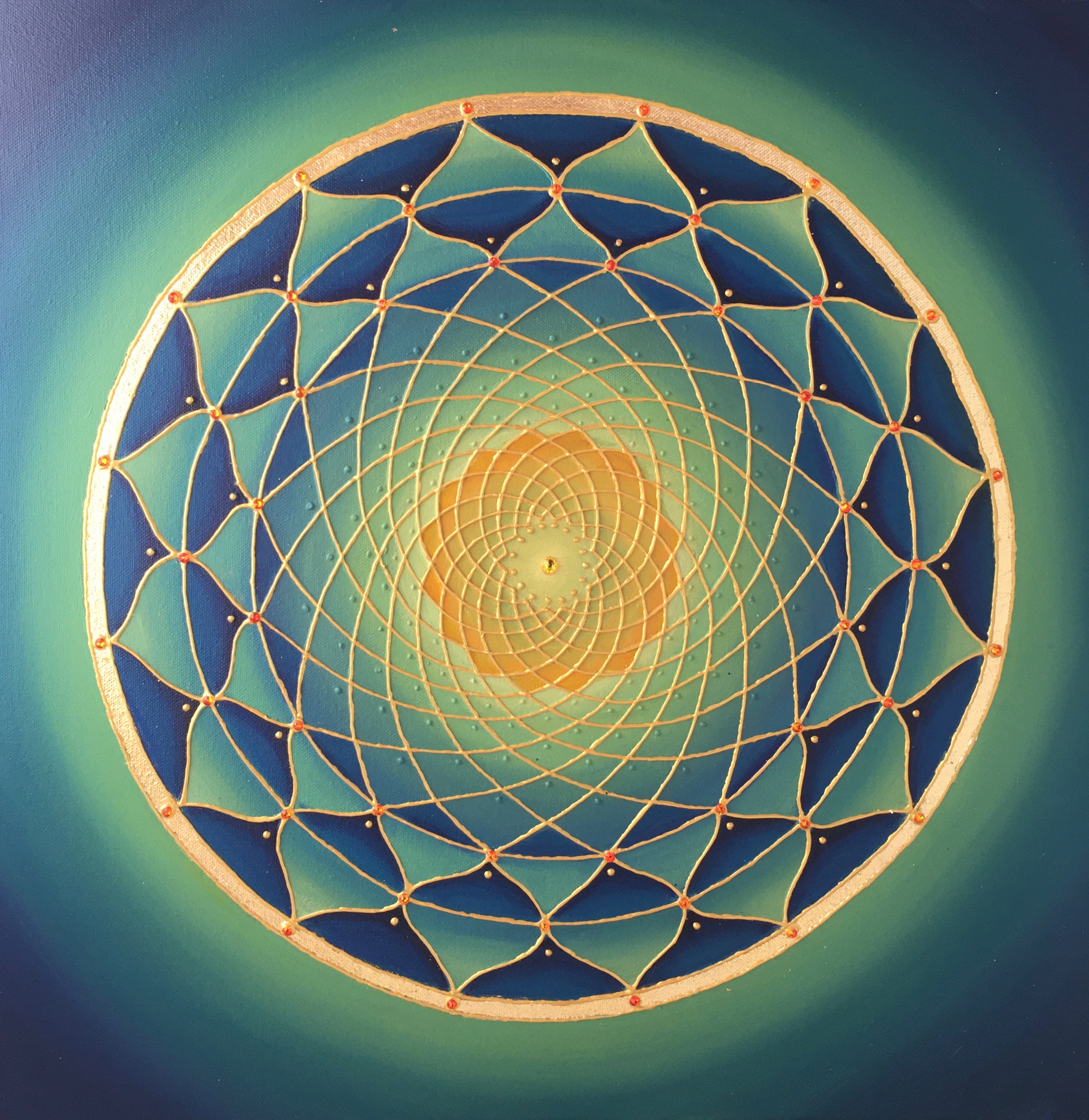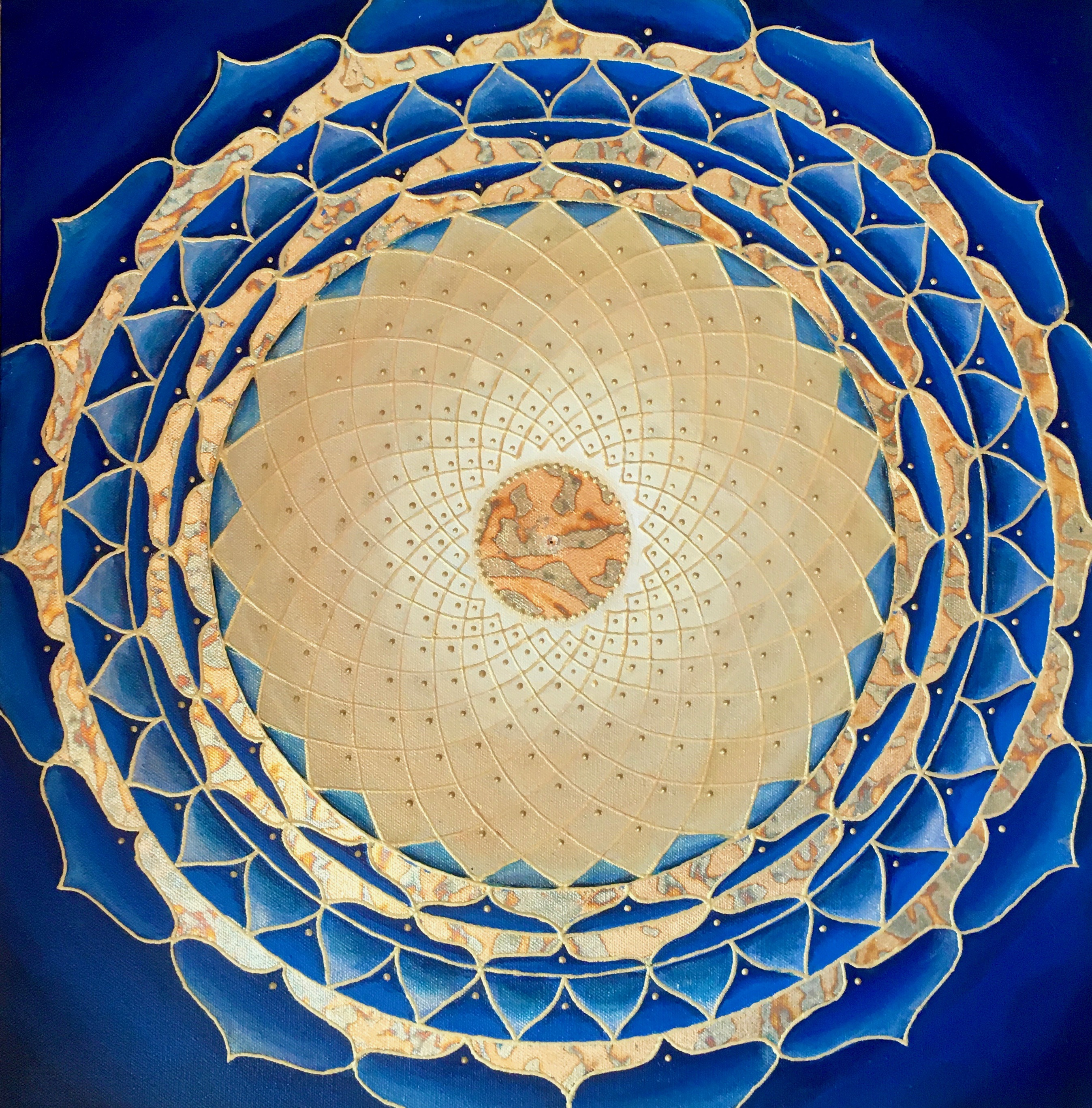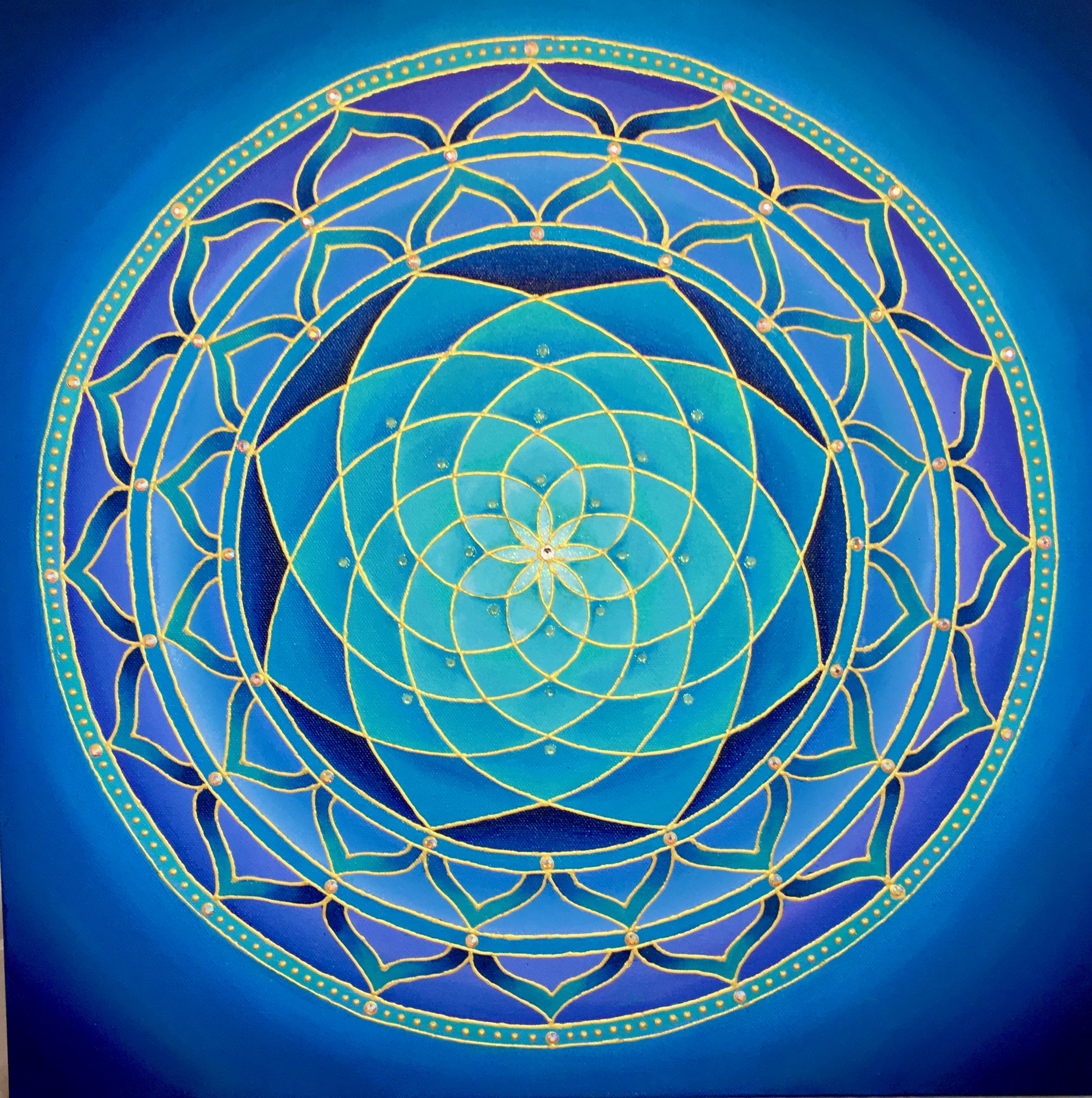 I’m attracted to symmetry, the beauty of form arising from balanced proportions. Colors and forms in nature are often my inspiration. My paintings may resemble the sun, ocean, sky, clouds, mountains, rainbows, peacocks, or a sunflower. Mandalas represent ‘wholeness,’ helping us connect to our center and embody a feeling of holistic completeness.